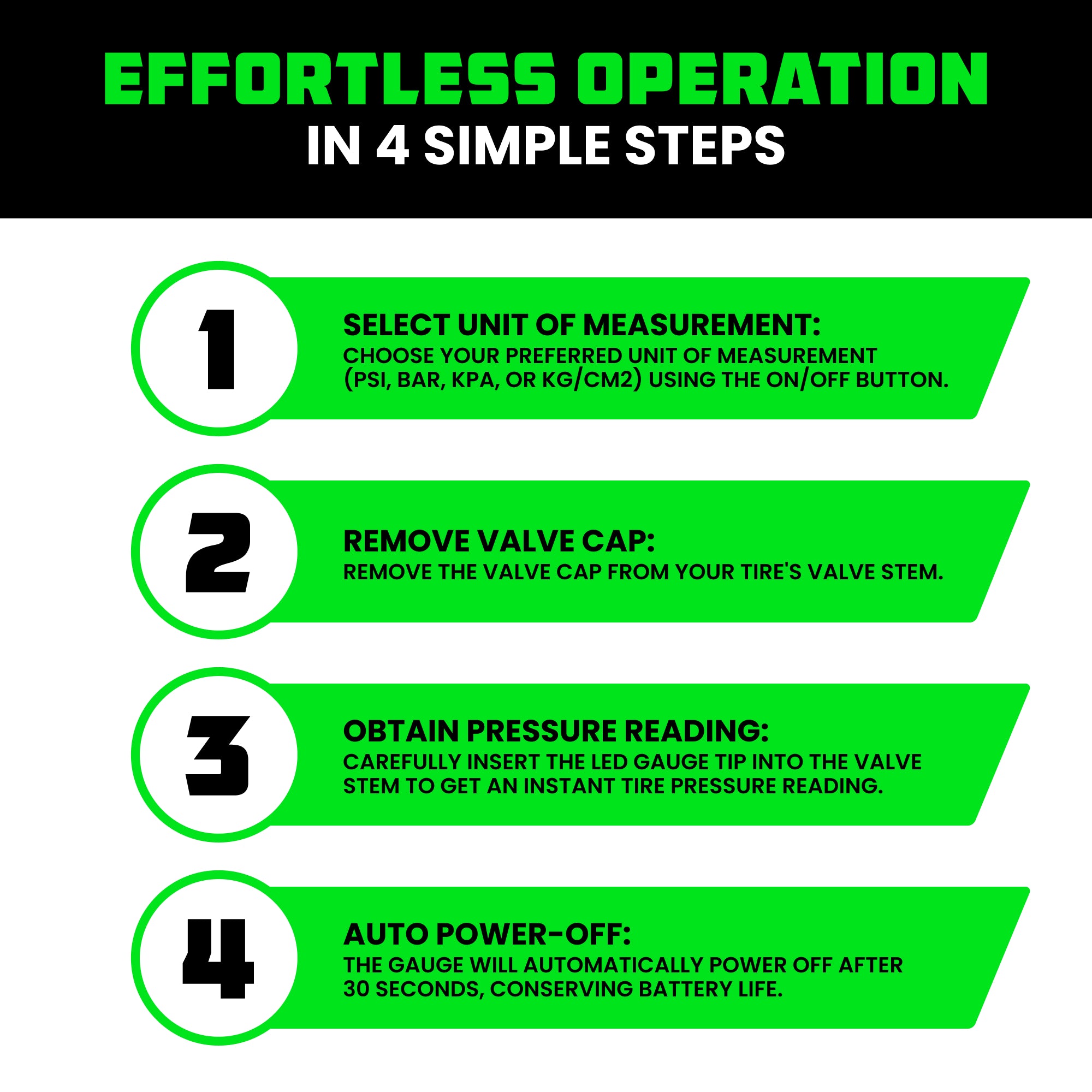 - HIGH QUALITY TOOL - Ergonomic Design with Certified Accuracy in 4 Ranges: PSI, BAR, KPA, Kg/cm2