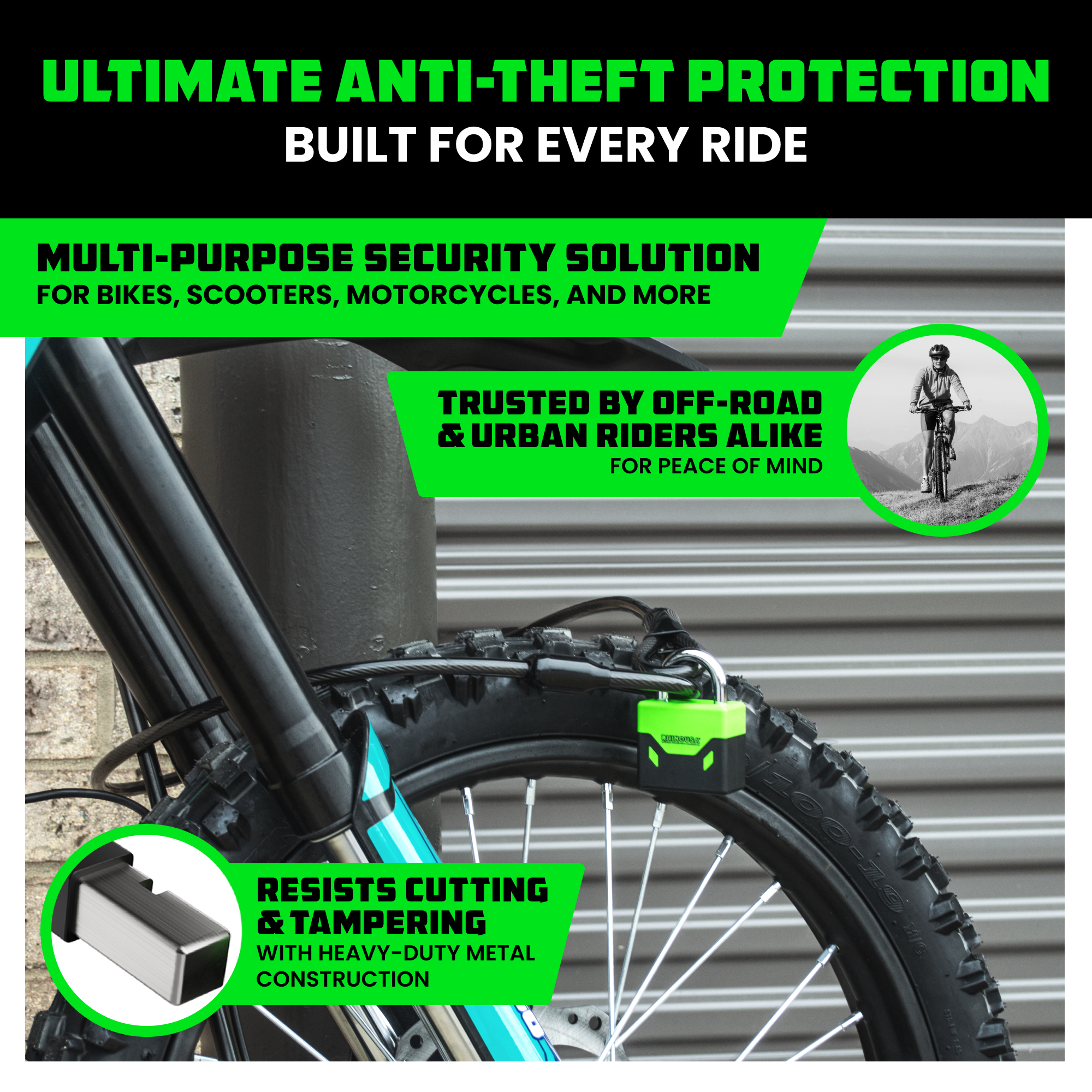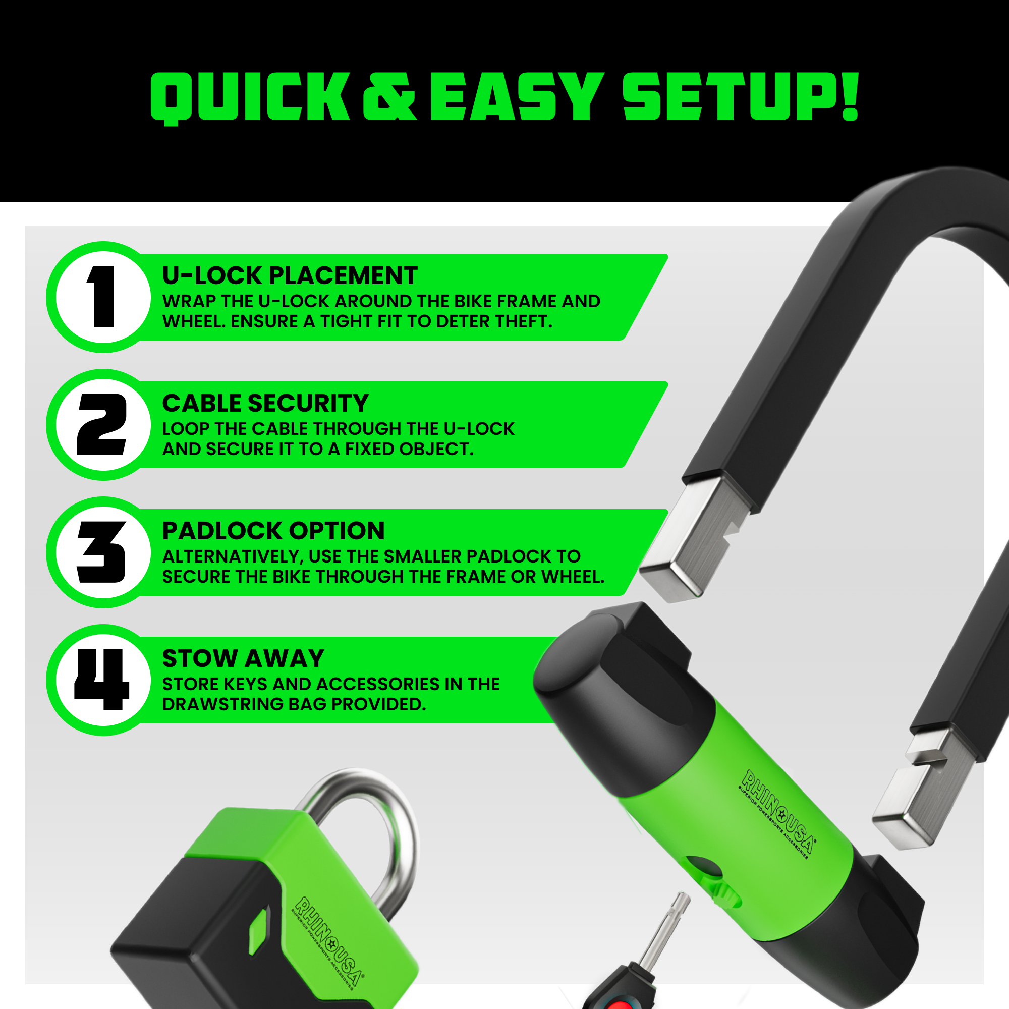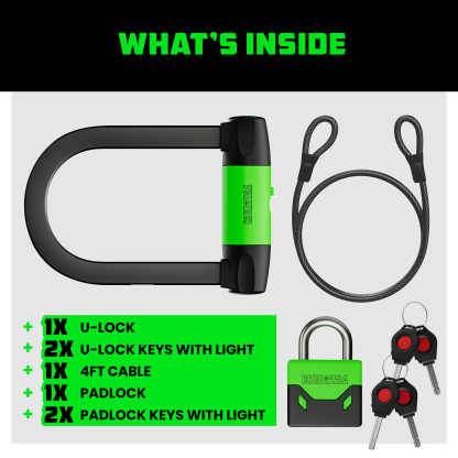 - DUAL PURPOSE LOCKS - Our Bike Lock Comes With Both a U-Lock and a Padlock, Offering Versatile Security Options. Use the U-lock for Maximum Protection in High-Risk Areas, and opt for the Lighter Padlock for Easy Transportation and Quick Stops.