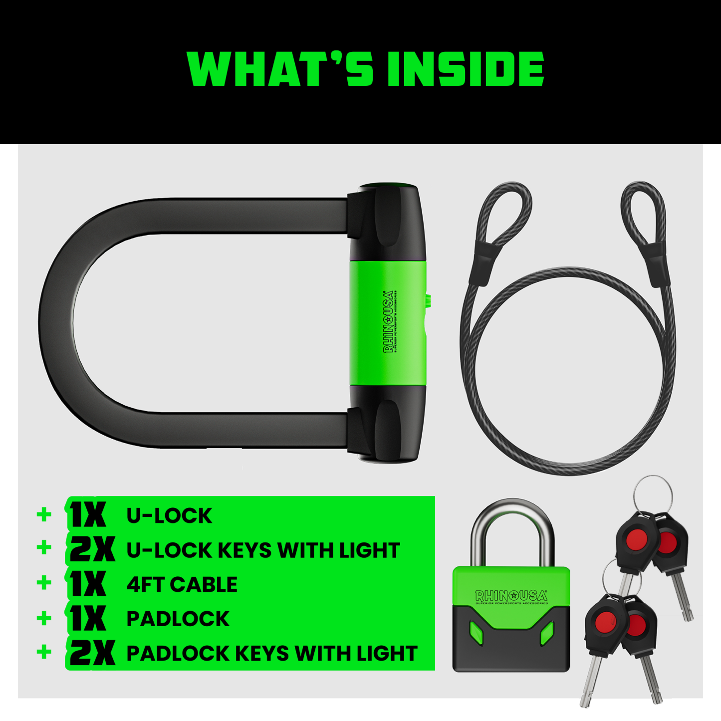 - MANY DIFFERENT USES - Perfect for Securing Bikes, Motorcycles, Scooters, EBikes, Gates, Tools, Trailer Accessories and Even Outdoor Equipment. The Rhino USA Lock can Handle it all.