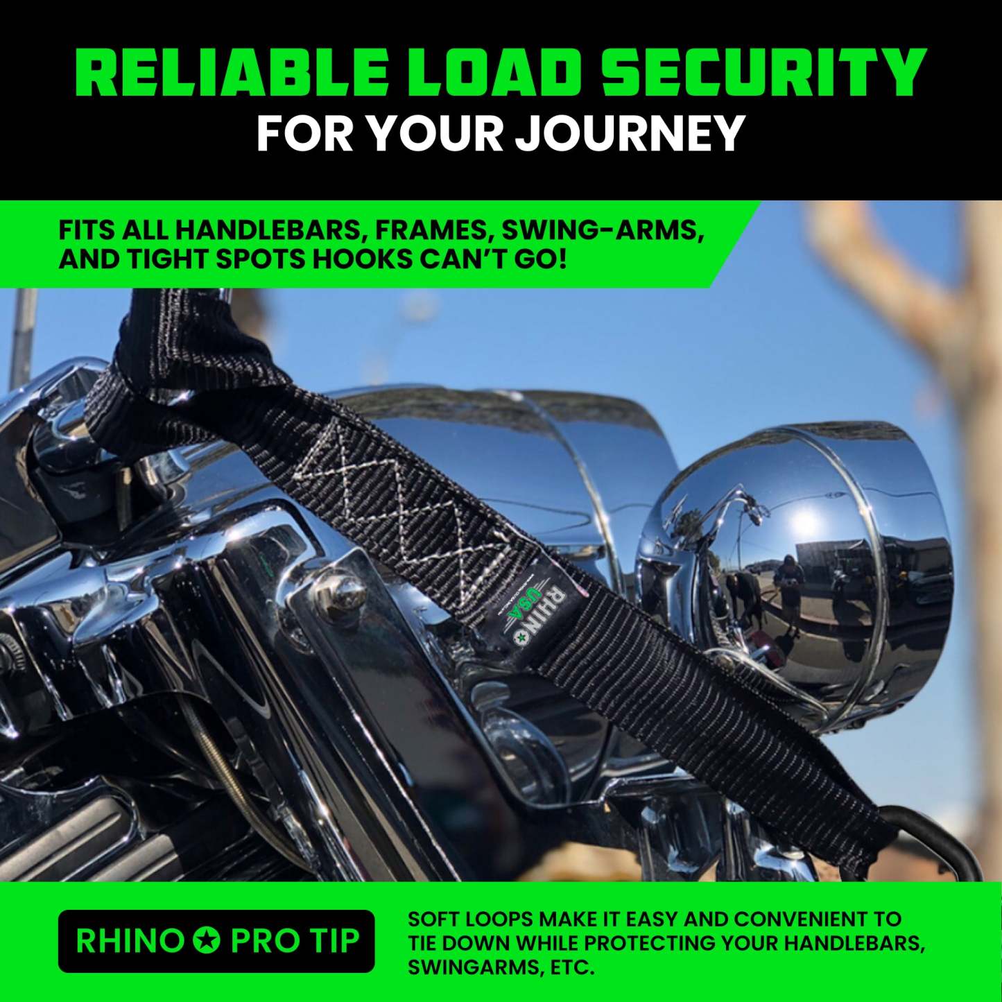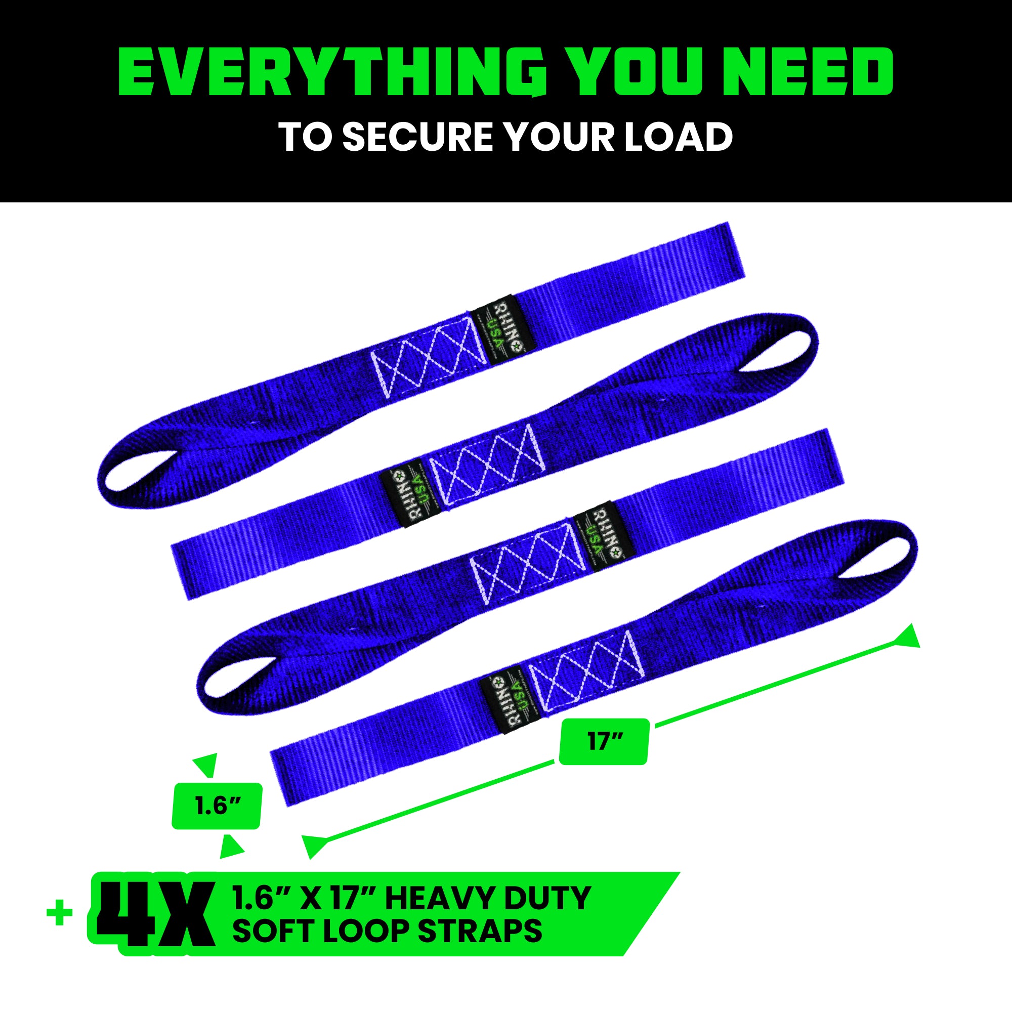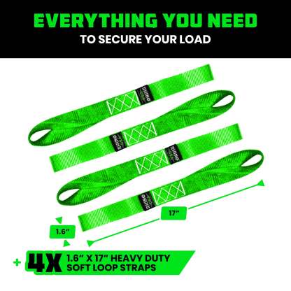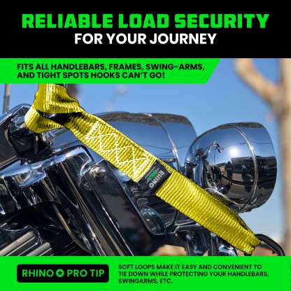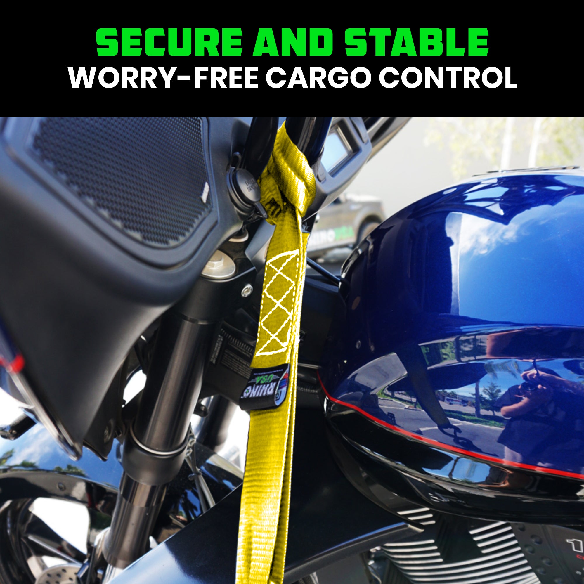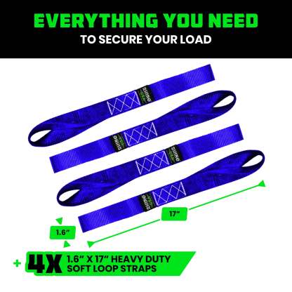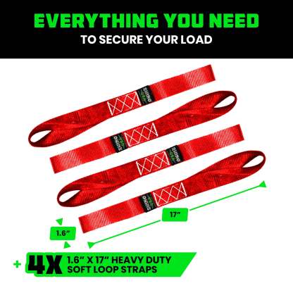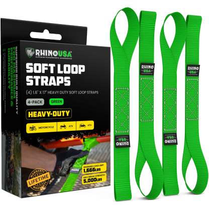 - SOFT LOOPS MOTORCYCLE TIE DOWN STRAPS (4PK) - 10,427lb Max Break Strength 1.6” x 17” Heavy Duty Tie Downs for use with Ratchet Strap - Secure Trailering of Motorcycles, dirt bikes, Kayak, Jeep, ATV, UTV