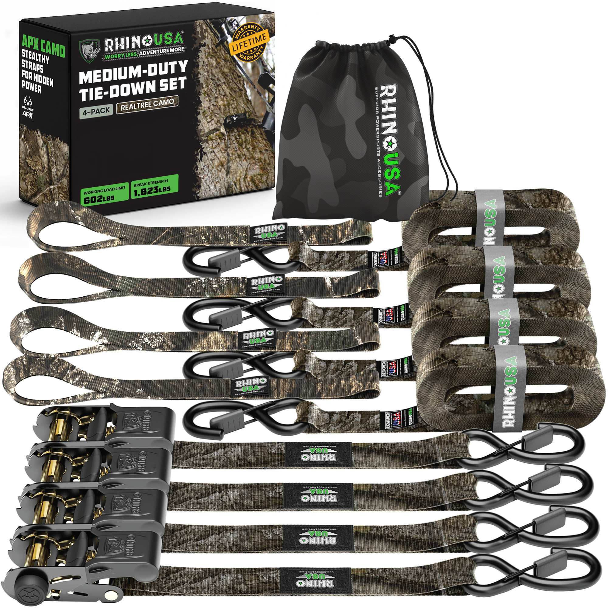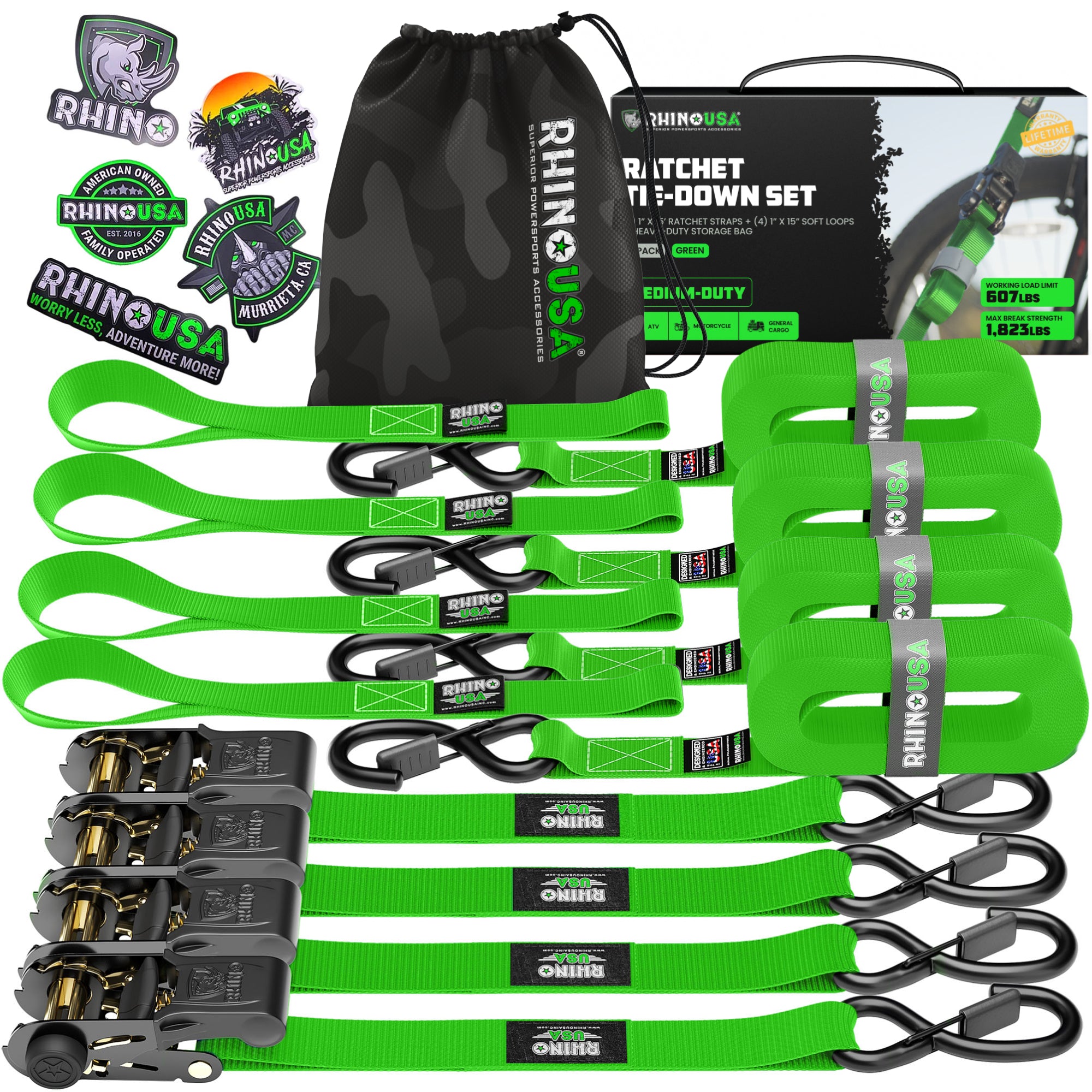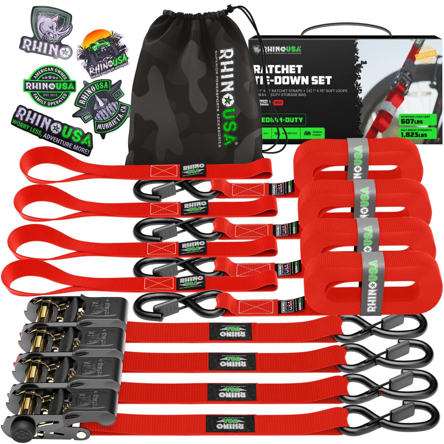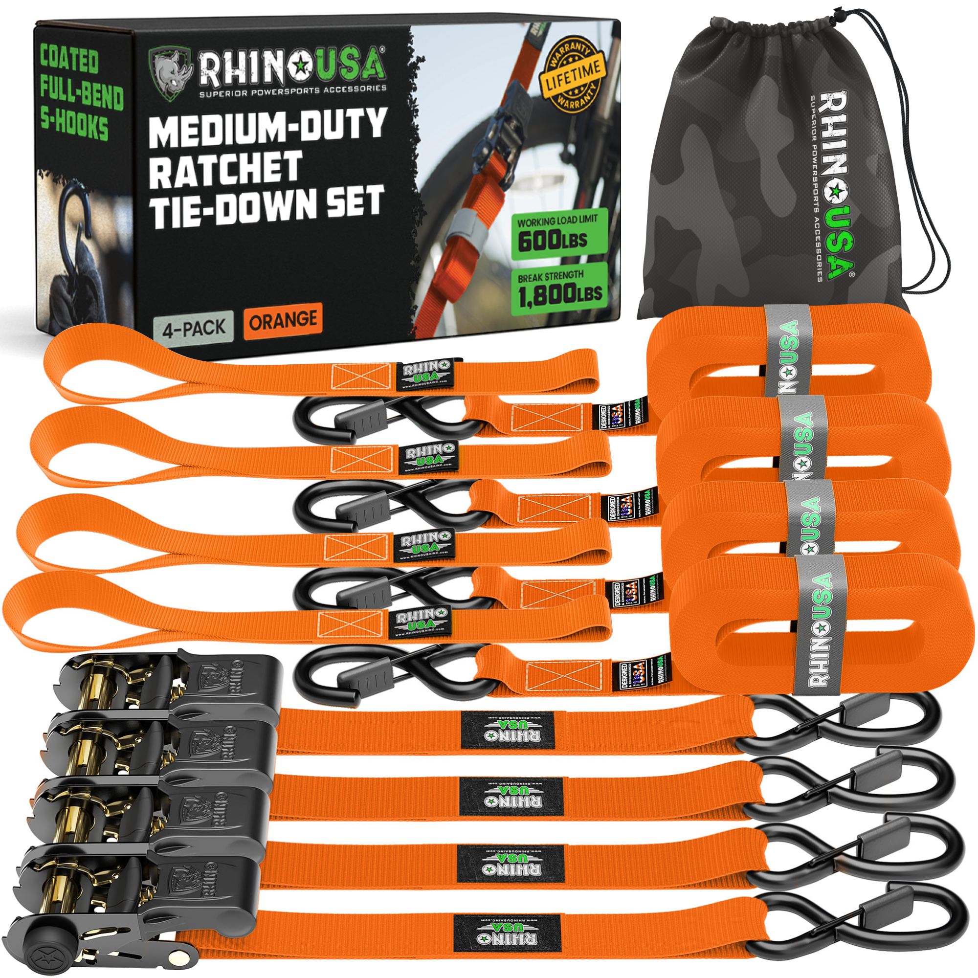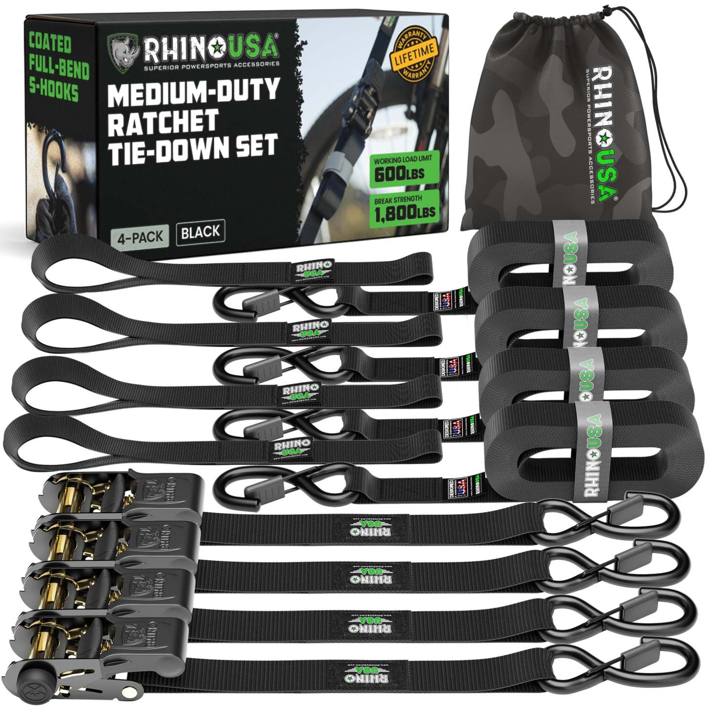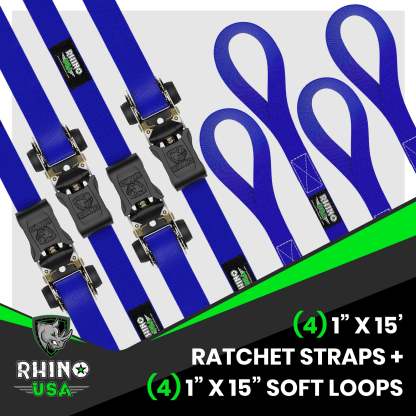 RATCHET STRAPS (4PK) - 1,823lb Guaranteed Max Break Strength, Includes (4) Premium 1in x 15ft Rachet Tie Downs with Padded Handles. Best for Moving, Securing Cargo, motorcycle tie downs.