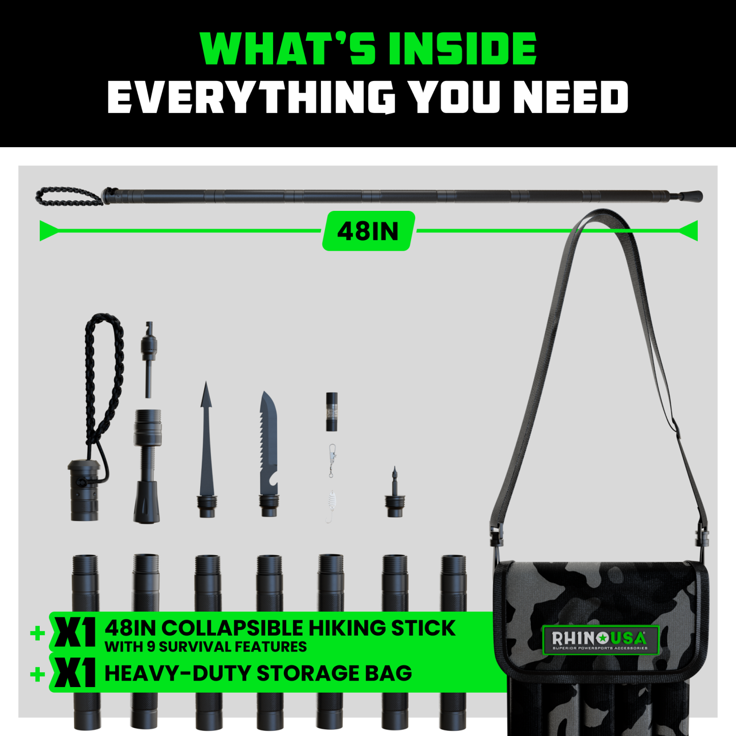 What truly sets this tactical gear apart is its integrated survival kit. Equipped with essential tools such as a spear, fire starter, compass, fishing line and tackle, screw driver, knife, and bottle opener, this stick is perfect for adventurers and those who enjoy outdoor exploration. It’s more than just a hiking pole—it’s the ultimate survival kit on-the-go, making it a must-have piece of apocalypse gear.